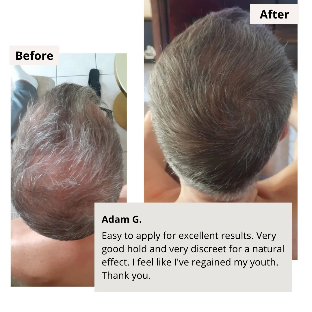Even in areas that appear thinning, there are often very fine or light-coloured hairs remaining. The powder will cling to these hairs to visually fill in the gaps and create a natural density effect. This is what allows for a uniform result, even in cases of significant hair loss.